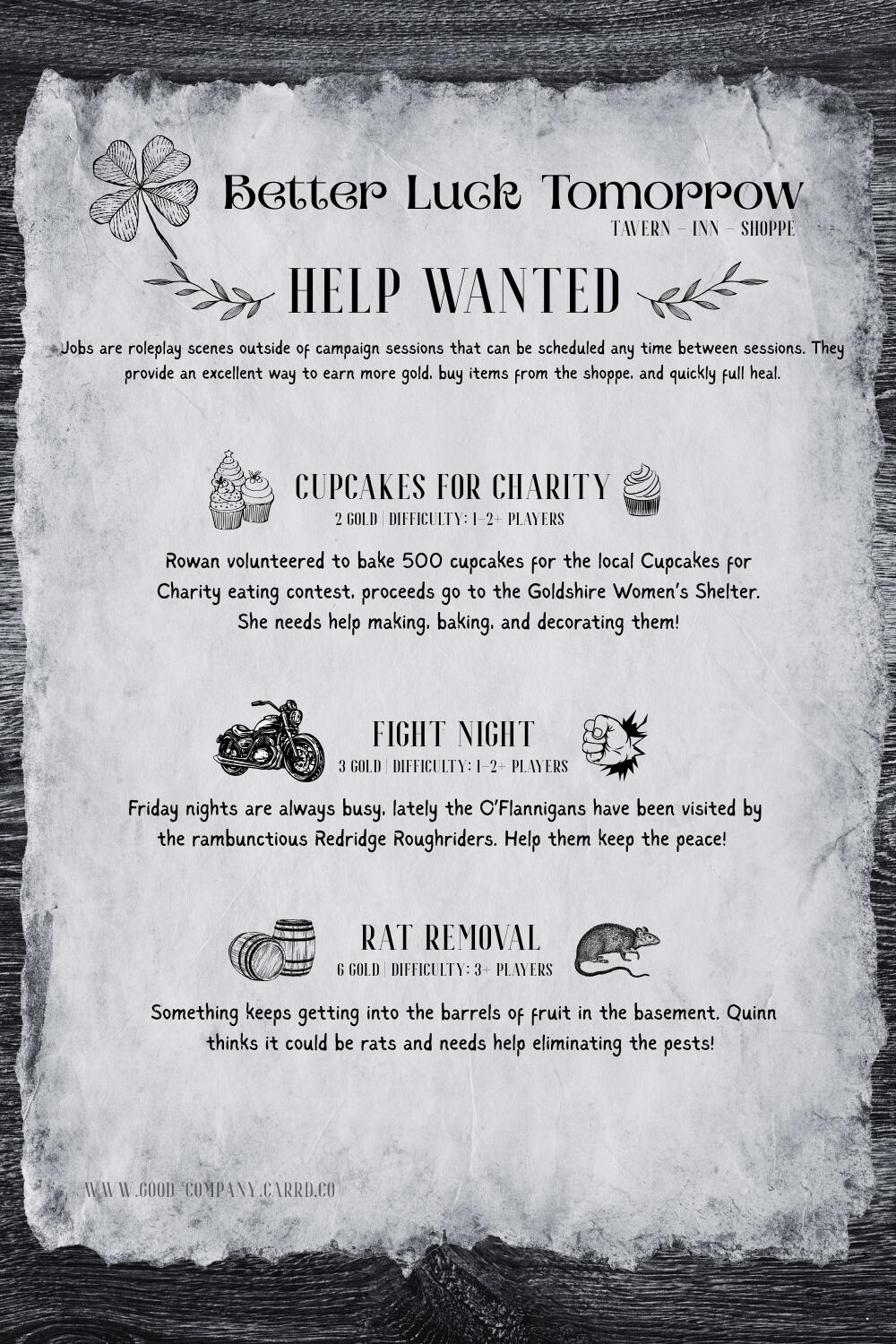 Each player will be allotted X amount of currency based on their socio-economic status. Players will keep track of their currency amount on their Character Sheet, using their coin to buy items to assist in roleplay or combat. They also have the option to earn additional money through quests or even asking NPCs for odd jobs. Player coins are restricted to the campaign, money can’t be brought in from outside RP.