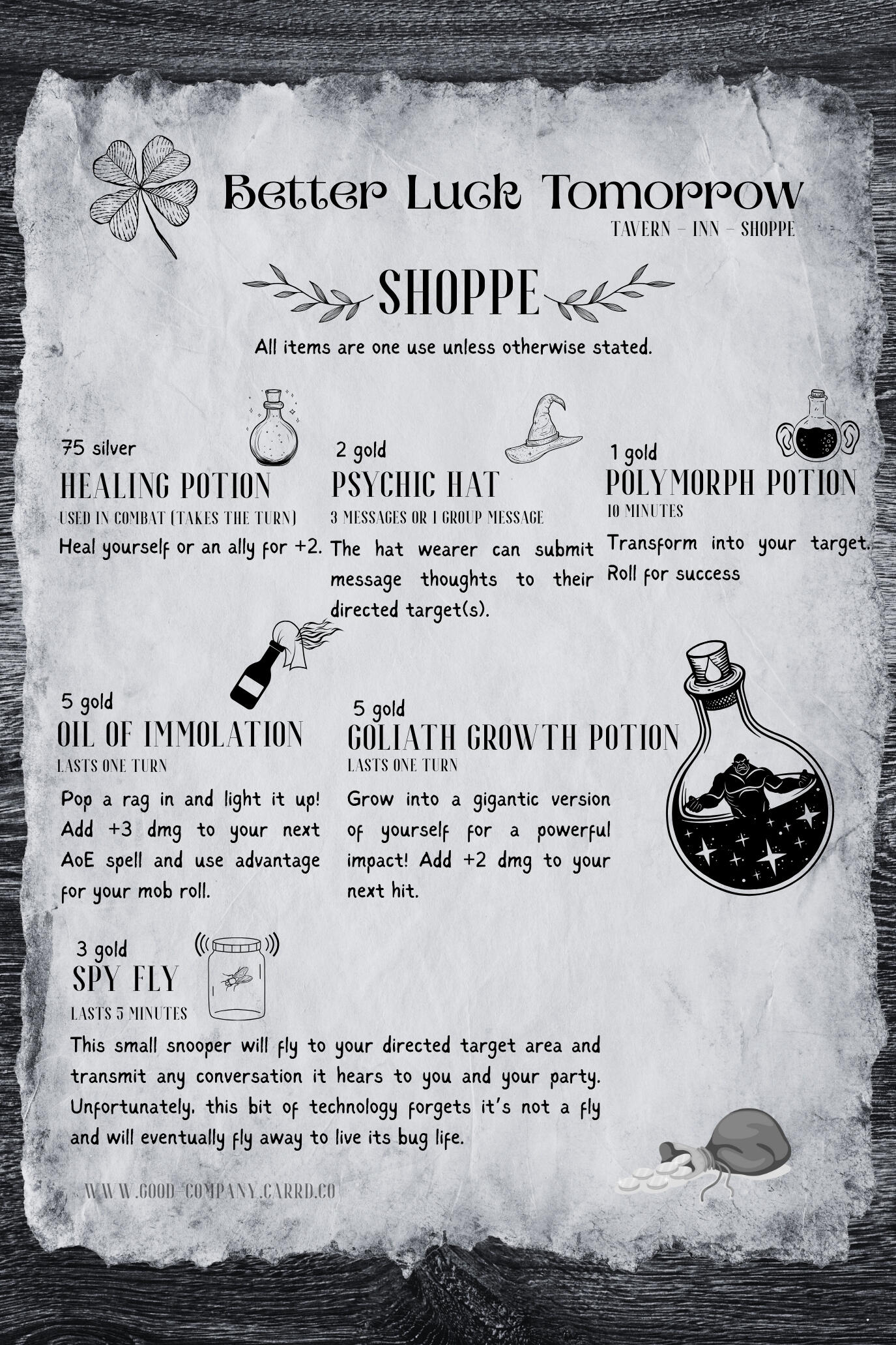 Players can purchase items from Better Luck Tomorrow (or other campaign vendors) to help heal them in battle, increase their damage output, or allow unique abilities for one turn.Lastly, inspiration, which allows a player to roll advantage on whatever roll they pick, can be rewarded to players by the DM when players take actions that make the game more exciting, amusing, or memorable. Inspiration doesn't stack and will be reset after the session.